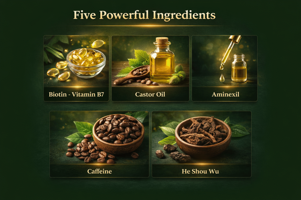 • Caffeine: Helps block DHT and stimulates hair follicles for improved growth.